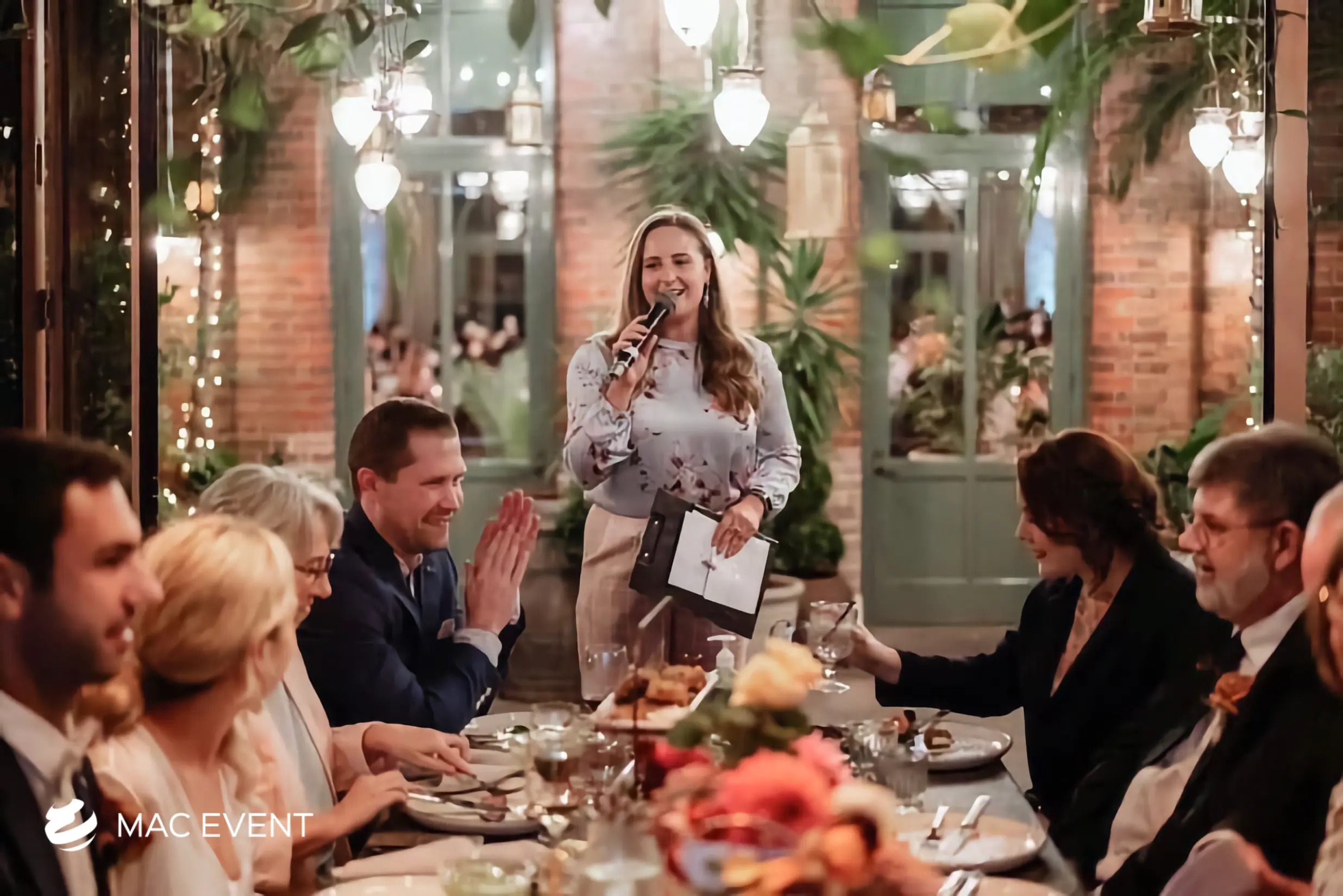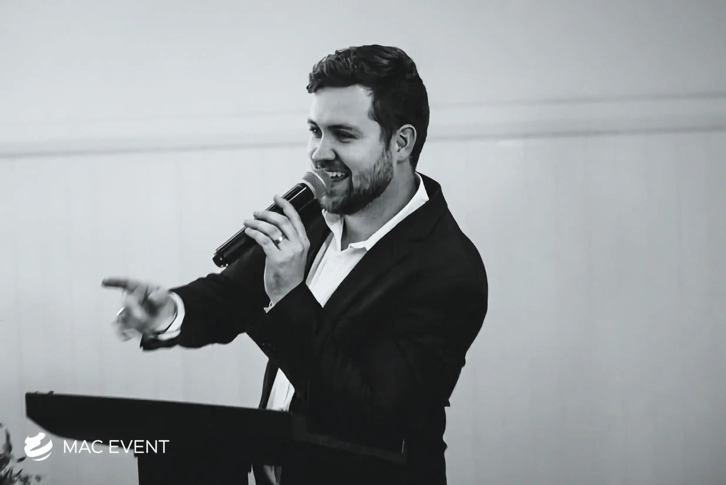 Master of ceremonies for weddings, private parties and corporate events. Bilingual emcee, timeline control, vendor coordination, professional hosting.